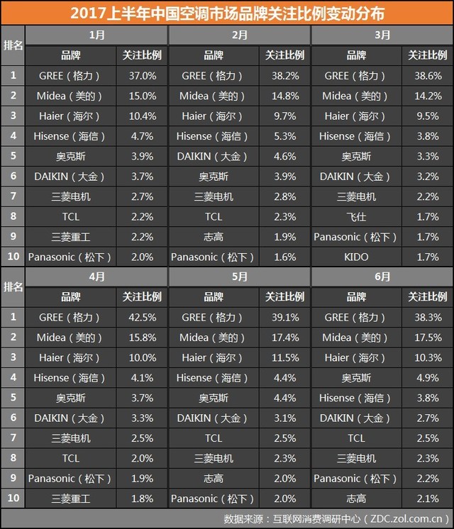 2017上半年中國空調市場品牌關注比例變動分布